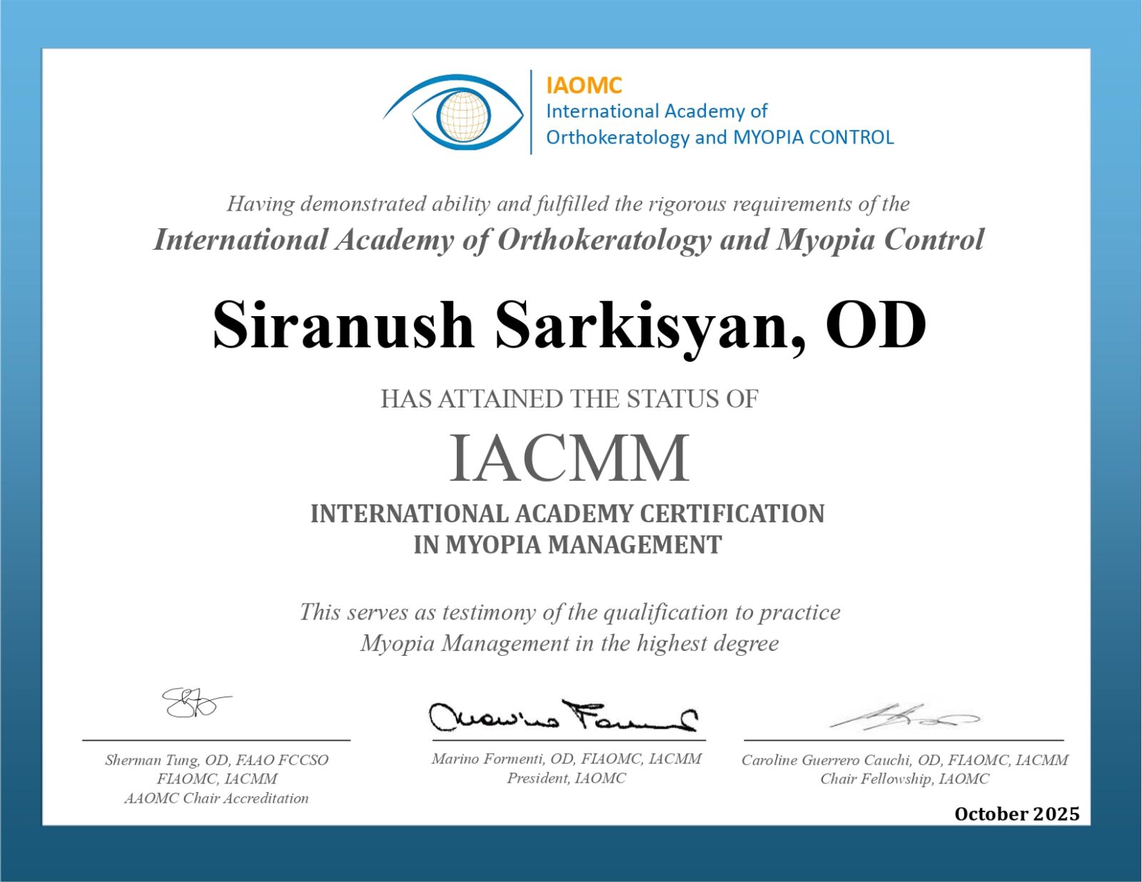 Dr. Sarkisyan is certified in Advanced Myopia Management (IACMM) and an active member of the American Academy of Orthokeratology and Myopia Control (AAOMC). With specialized training and a passion for children’s vision health, she provides the latest, most effective strategies to manage myopia and preserve visual comfort and clarity for years to come.